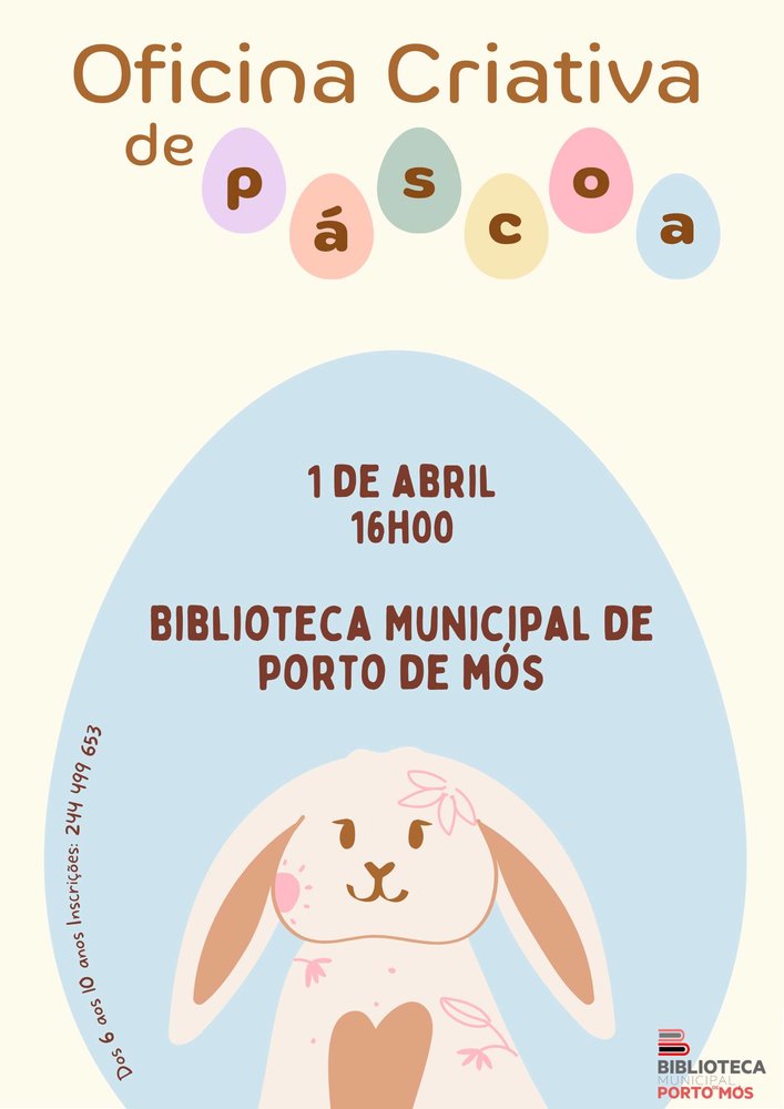 A Biblioteca Municipal de Porto de Mós promove, no próximo dia 1 de abril, pelas 16h00, uma Oficina Criativa de Páscoa, dirigida ao público infantil (6 a 10 anos).