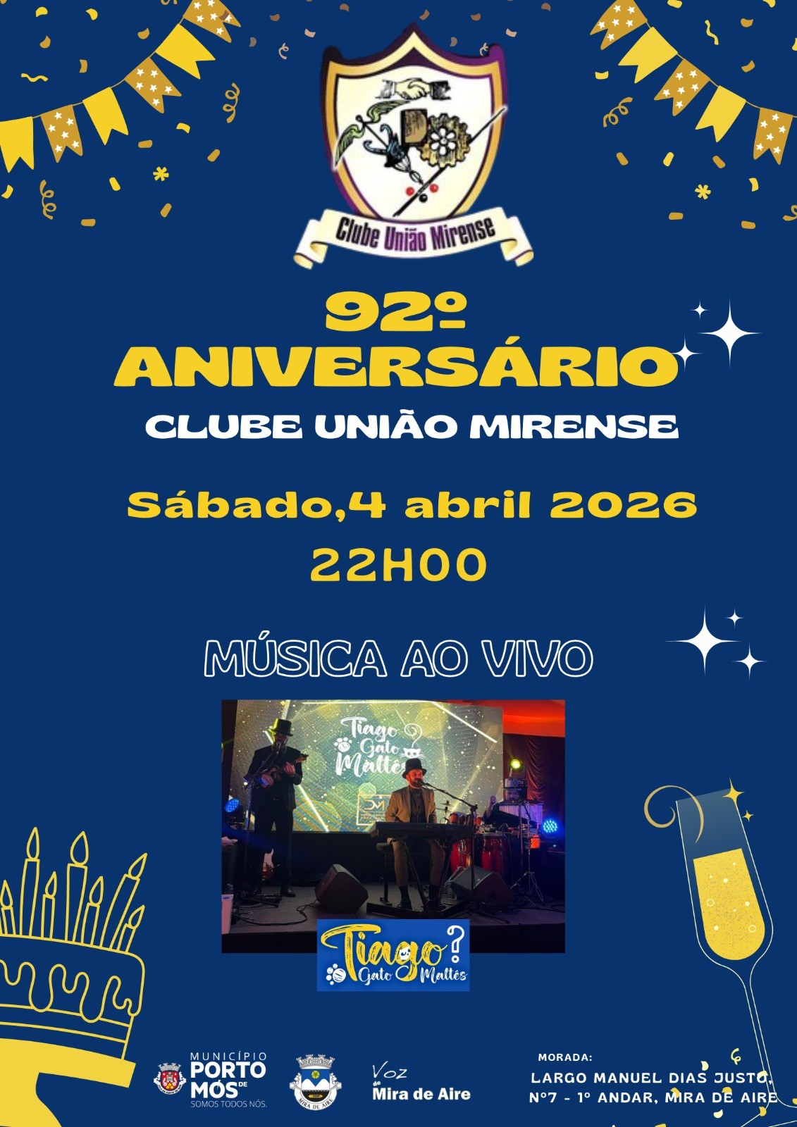 Festa do 92º aniversário do Clube União Mirense com animação de música ao vivo, com a banda "Tiago Gato Maltês". Será distribuido bolo e champagne pelos convidados. O evento será aberto a sócios e não sócios com entrada gratuita.
