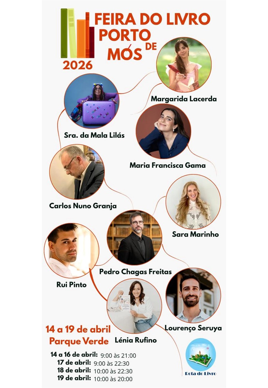 Ao longo da semana, a feira contará com a presença de diversos autores e convidados, entre eles Vanessa Jesus, Carlos Nuno Granja, Andreia Ramos, Sra. da Mala Lilás, Pedro Chagas Freitas, Inês Martins, Teresa Noronha, Lénia Rufino, Margarida Lacerda, Maria Francisca Gama, Lourenço Seruya, Tania Teixeira, Sara Marinho, Rui Pinto e Monica Guerra, contando ainda com a moderação de Joana Zambujo de Oliveira, Fabiola Valente, Inês Tavares e Sara Junior.
