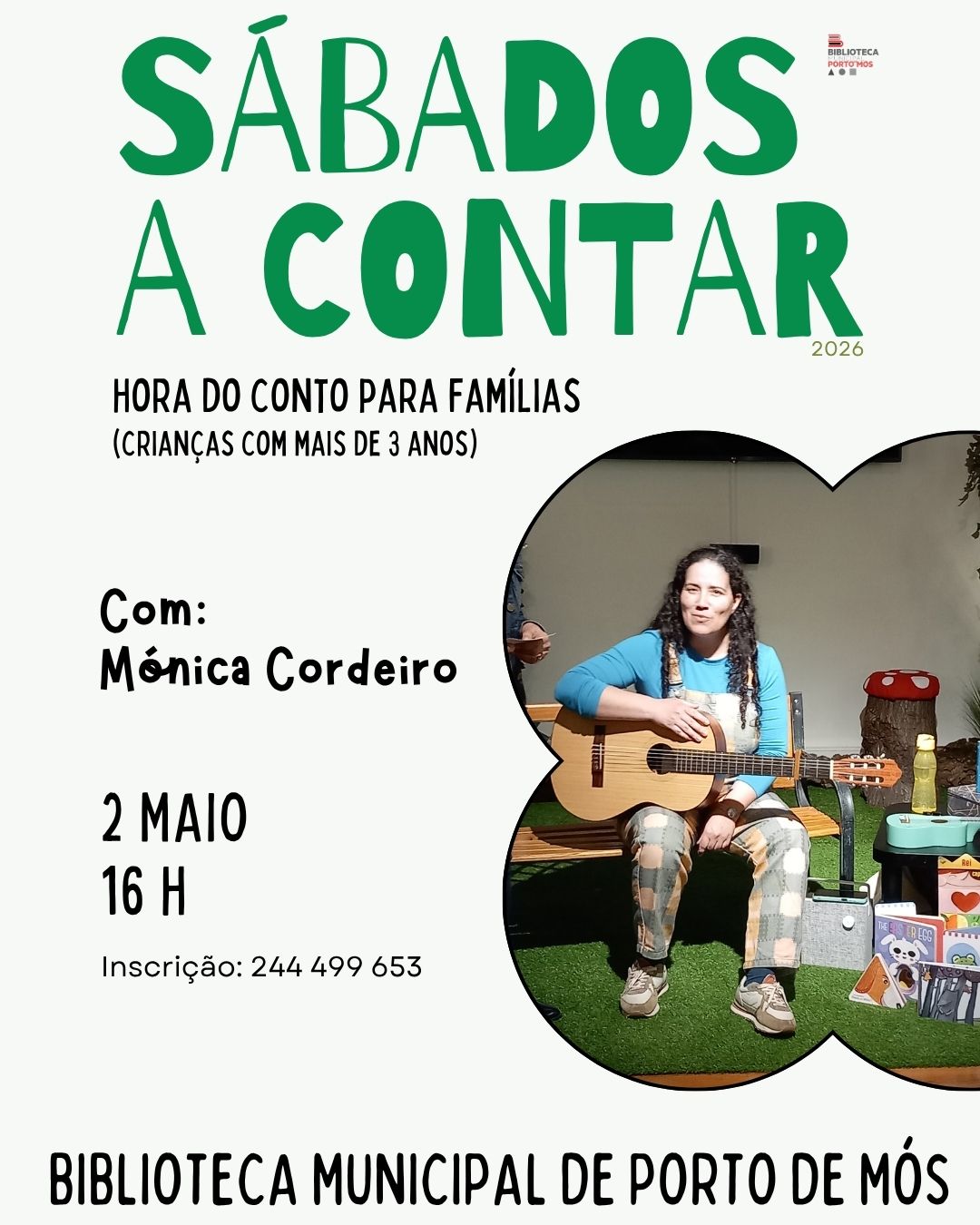No dia 2 de Maio, a sessão contará com histórias cantadas por Mónica Cordeiro, criando uma experiência envolvente que alia a leitura à música.