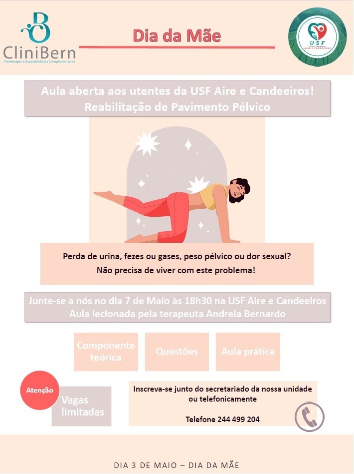 No âmbito do Dia da Mãe, no dia 7 de maio pelas 18h30, a USF Aire e Candeeiros convida-o para uma aula aberta sobre Reabilitação do Pavimento Pélvico.