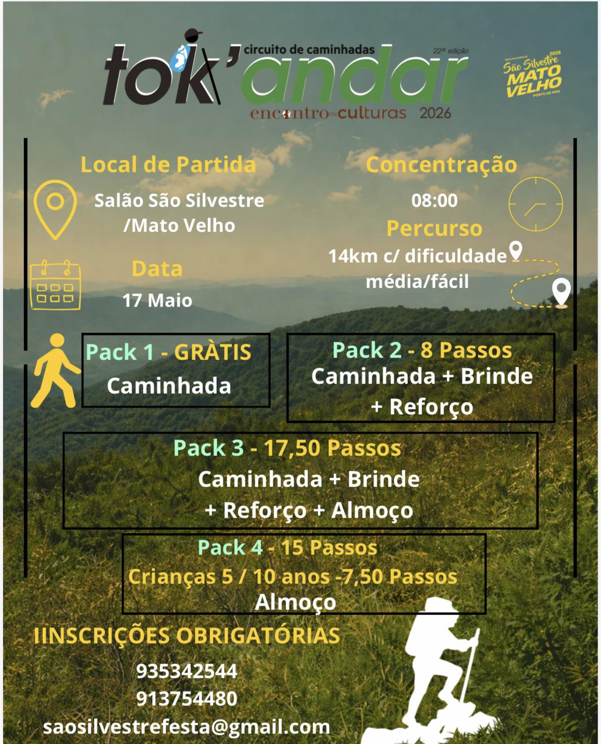 No dia 17 de maio, no âmbito do Tok’andar, São Silvestre - Mato Velho convida toda a comunidade a participar na caminhada “São Silvestre – Mato Velho”.