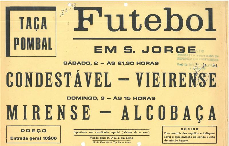 O documento escolhido para o mês de Outubro recorda um fim-de-semana de futebol, há 47 anos, onde dois dos jogos foram disputados com equipas do concelho (Condestável e Mirense), no campo de São Jorge, a contar para a competição “Taça de Pombal”.