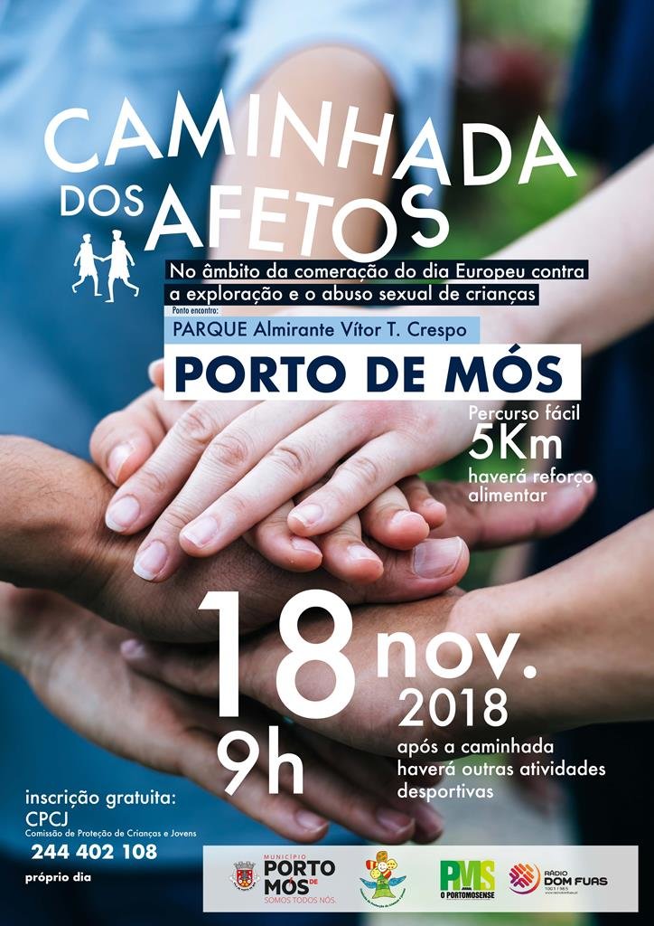 No âmbito da Comemoração do Dia Europeu Contra a Exploração e Abuso Sexual de Crianças, o Município de Porto de Mós, em parceria com a Comissão de Proteção de Crianças e Jovens de Porto de Mós, está a promover a Caminhada dos Afetos, que terá lugar no dia 18 de novembro, pelas 09h00, no Parque Almirante Vítor Trigueiros Crespo.