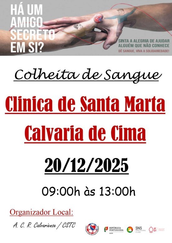 No próximo dia 20 de dezembro, entre as 09h00 e as 13h00, a Clínica de Santa Marta, na Calvaria de Cima, cede as suas instalações para receber esta ação de recolha de sangue, essencial para salvar vidas e garantir a disponibilidade suficiente de sangue para realizar transfusões para pacientes em cirurgias, tratamentos oncológicos, transplantes e acidentes graves. Além disso, a doação permite um check-up gratuito de saúde para o doador, que é testado para doenças como hepatites e HIV. Uma única doação pode ajudar várias pessoas porque o sangue é separado em componentes como glóbulos vermelhos, plaquetas e plasma.