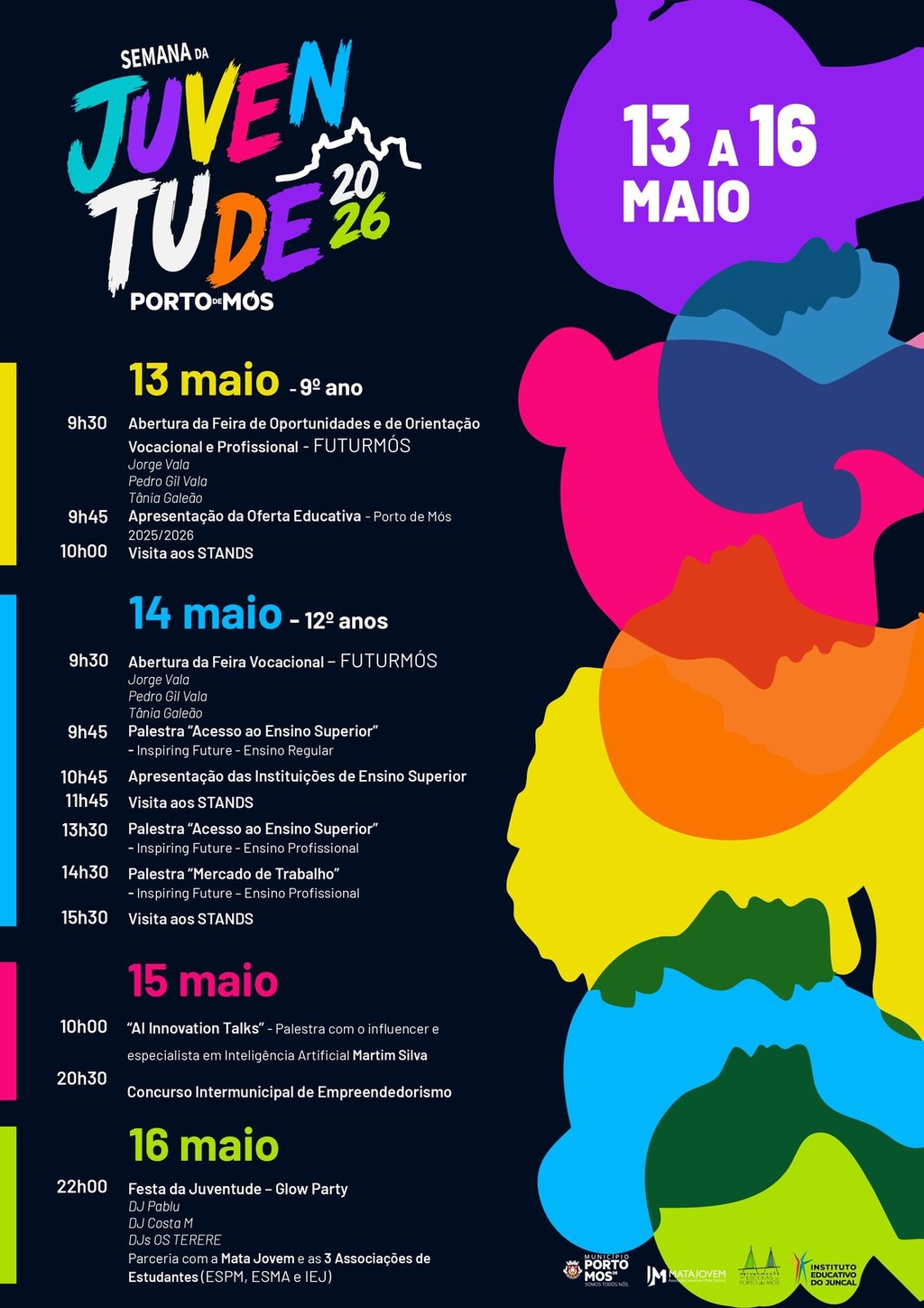 O arranque faz-se com a Futurmós – Feira de Oportunidades e Orientação Vocacional e Profissional, dirigida aos alunos do 9.º e 12.º anos. Através da apresentação da oferta educativa local e de sessões dinâmicas com a Inspiring Future, os estudantes têm a oportunidade de explorar percursos formativos, conhecer o acesso ao ensino superior e compreender melhor as exigências do mercado de trabalho. A experiência é complementada com visitas aos stands das várias instituições presentes.