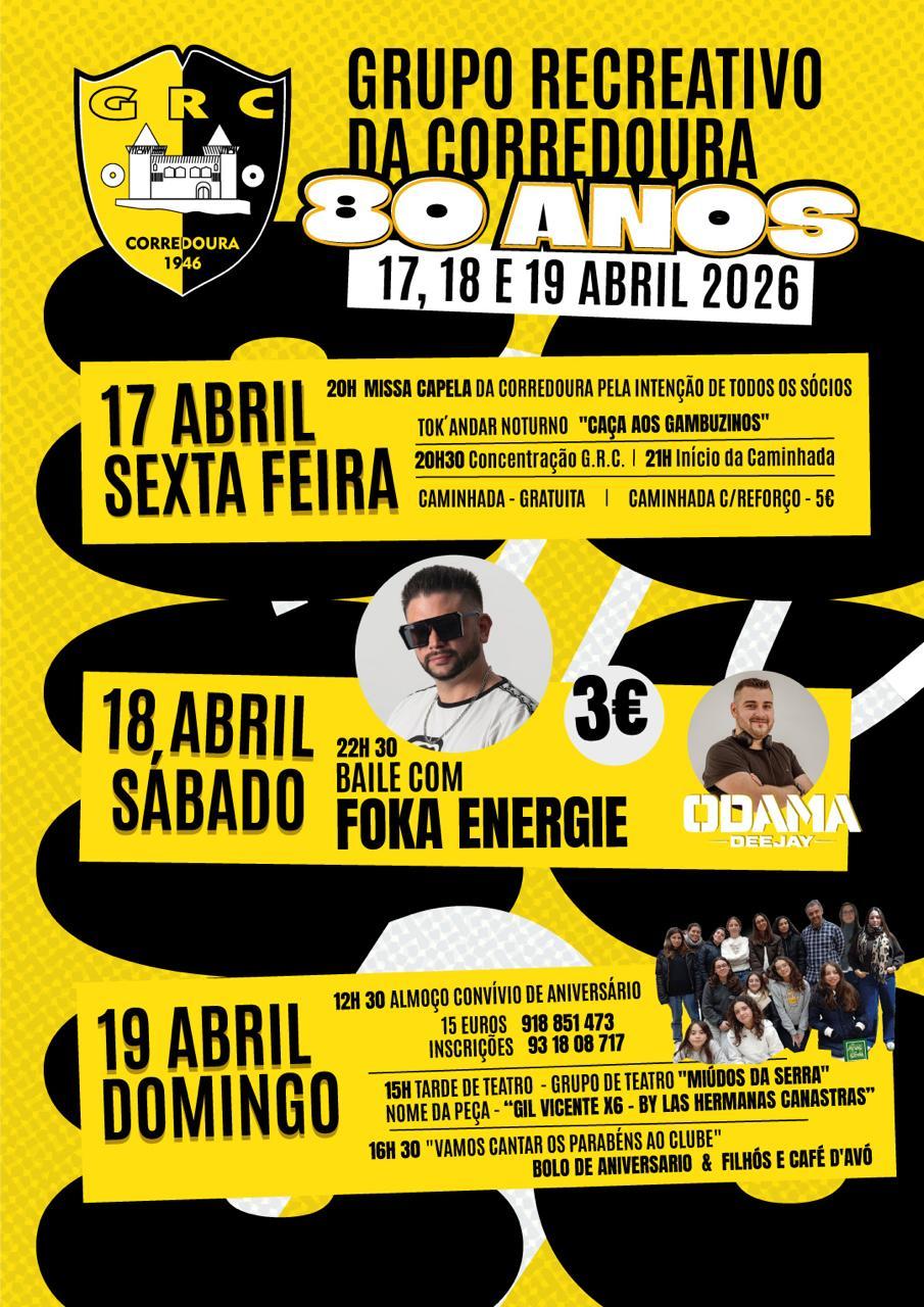 O Grupo Recreativo da Corredoura celebra 80 anos de história, tradição e convívio com um fim de semana repleto de atividades para toda a comunidade. De 17 a 19 de abril de 2026, junta-te a nós para três dias especiais de celebração, cultura e diversão.