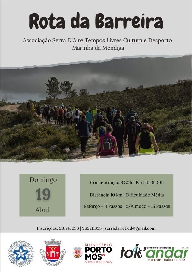 No âmbito do Tok'andar a Associação Serra D'Aire Tempos Livres Cultura e Desporto Marinha da Mendiga, convida todos a participar num passeio pedestre na Rota da Barreira.