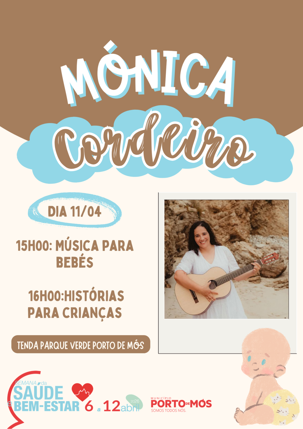 A programação tem início às 15h00 com uma sessão de música para bebés, dinamizada pela cantora Mónica Cordeiro, proporcionando um momento sensorial e afetivo que estimula o desenvolvimento dos mais novos através de sons, ritmos e interação.